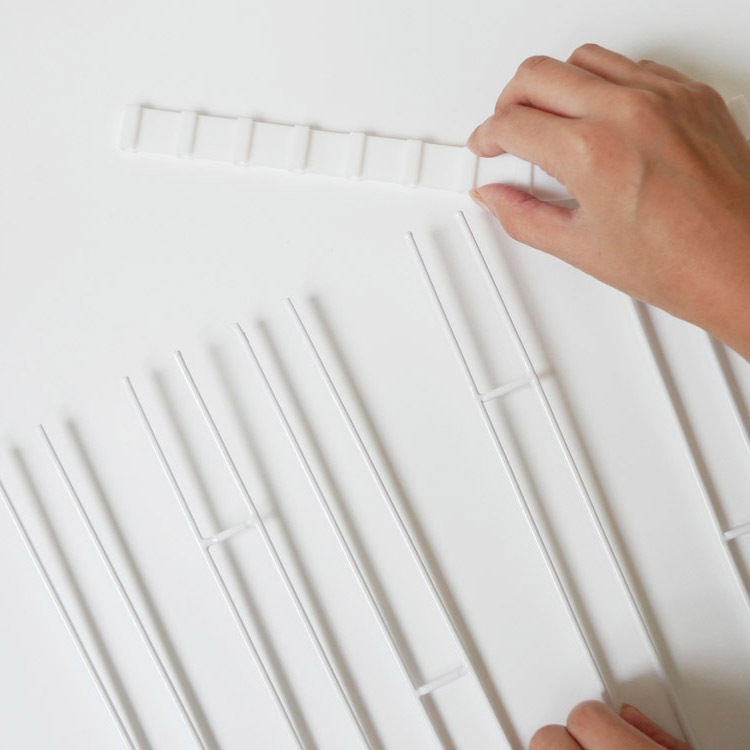 この水切りラックは折りたためるだけでなく、上下のキャップと全部のバーが取り外せ、組み合わせることができます。それにより、蛇口をよけて設置することができ、シンクにぴったり合った形が作れるのです。
