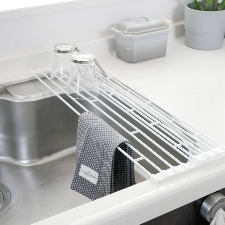 折り畳みや取り外しが可能で、ぴったりの場所に水切りスペースを作り出すことのできる水切りラック。シンクの形やキッチンの状況に合わせて設置でき、使わないときは丸めて収納できるので、少ないキッチンスペースを有効に使うことができます。水切りだけでなく作業台としても使えますよ。