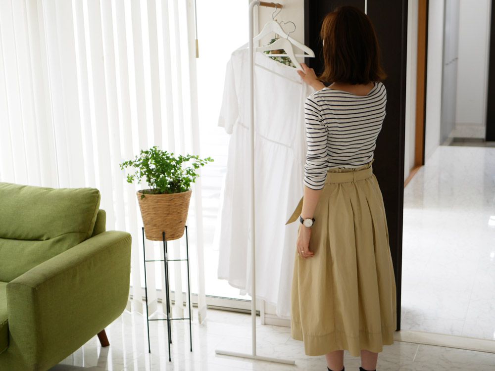 雨で濡れてしまったアウターをそのままリビングに持っていくのってちょっと戸惑いますよね。 そこで、活躍するのがこのスリムコートハンガー。 玄関のちょっとしたスペースにスリムに設置できるので、場所を取らずに帰宅後の濡れた衣類やレインコートなどを玄関で一時的に干すことができるんです。 雨の日の来客時にはタオルをサッとかけておけば、気の利いたお出迎えが出来ちゃいますね。