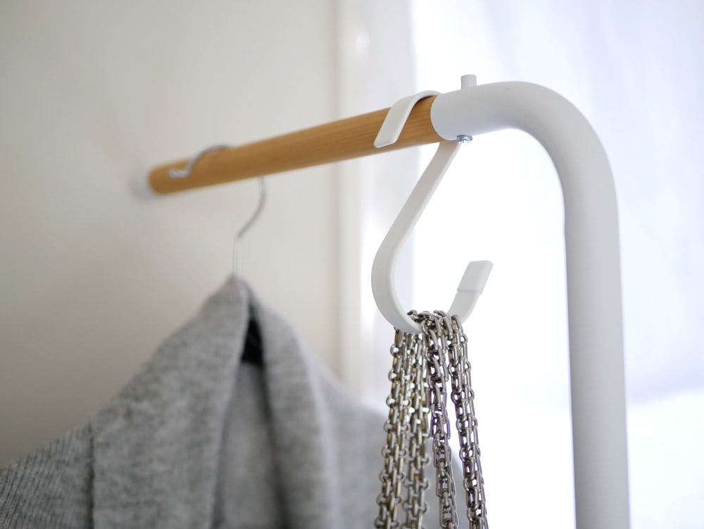 片手で持ち上げられる軽さで持ち運びに便利。リビング、寝室などのちょっとした隙間で使える手軽さが嬉しいですね。 無駄を省いたシンプルな作りで、お部屋の雰囲気にすっとなじむデザイン性もありつつ、機能性もバッチリ。 なにも掛けていない時は、ドライフラワーやグリーンを掛けてインテリアとしてもお洒落に楽しめます。