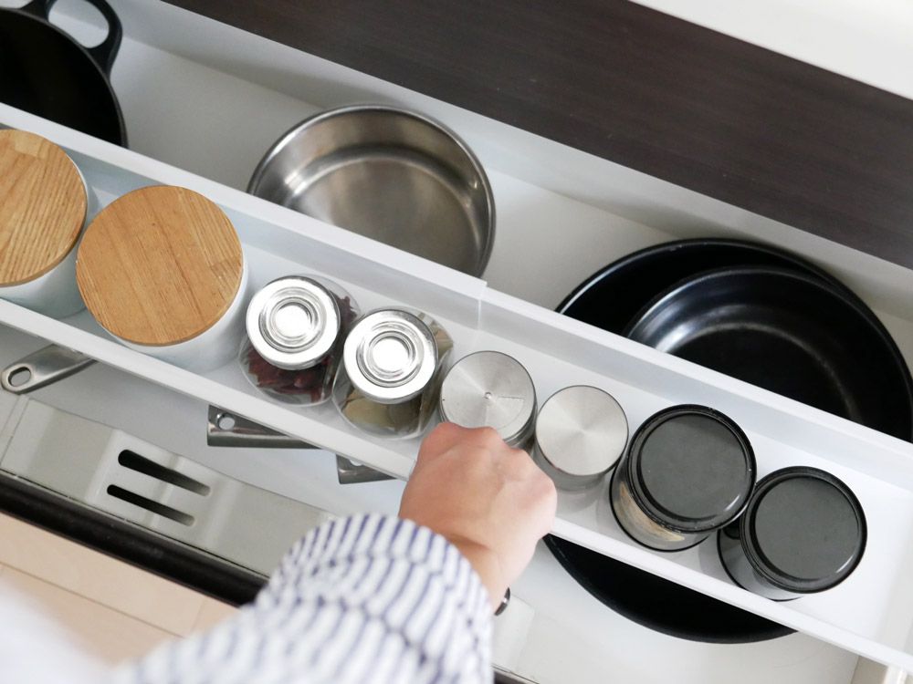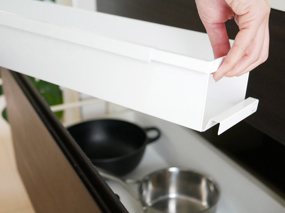 引き出しのサイドバーに引っ掛けて固定しないので、ラックは前後に移動できます。 ラックの下に収納したお鍋やフライパンを取り出す時には、ラックを奥に移動させることが出来て、細かいキッチンツールなどをサッと取り出して使いたい時には、ラックを手前に引いて使えるのでとっても機能的なんです。