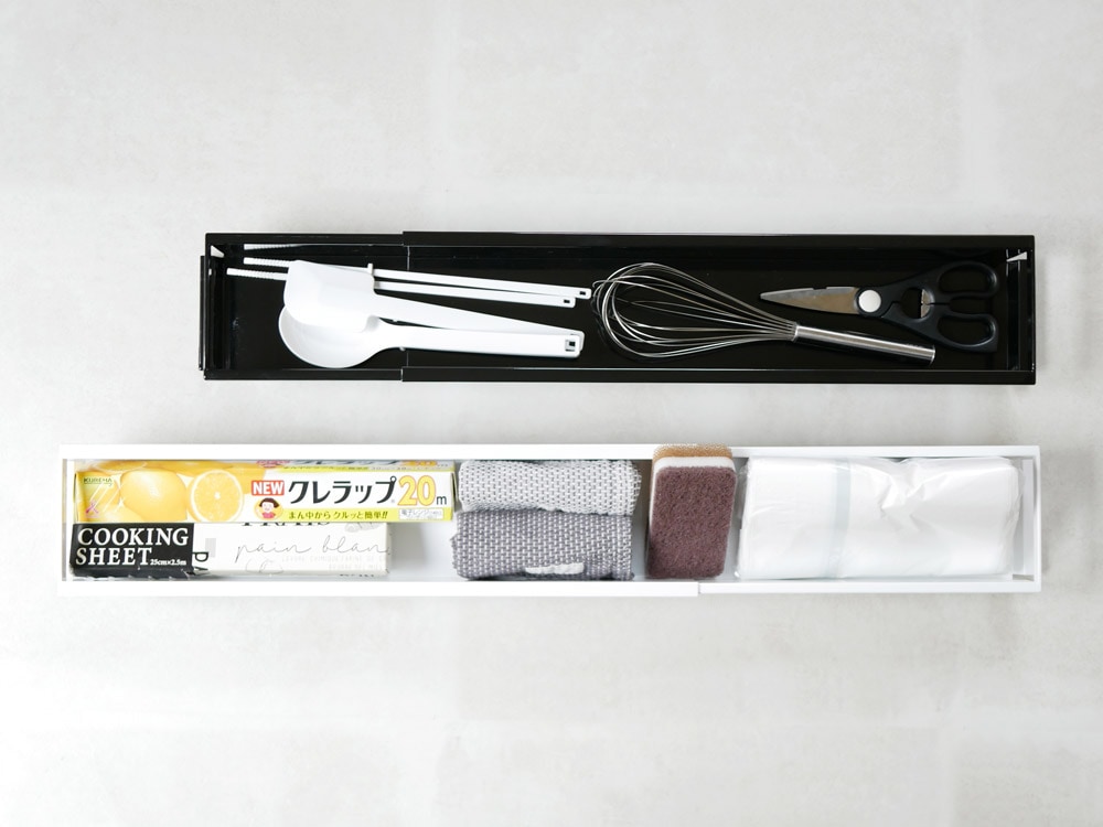 引き出し内のスペースを2段に分けて最大限に活用できる引っ掛け式の伸縮ラックのご紹介です。 キッチンのシンク下の引き出しは、意外と深さがあるものが多いのでたっぷり容量なのに上手に活用できていないという方はいませんか?。 引き出しのサイドバーに引っ掛けるだけの簡単設置で収納力UP! 色々なキッチンの引き出しに合うように伸縮できてどんな引き出しにもぴったりフィットします。 収納部分の奥行きは10cmとスリムですが、スパイスボトルやキャニスター、小皿やマグカップ、ラップや布巾などのキッチンアイテムの収納にぴったりです。