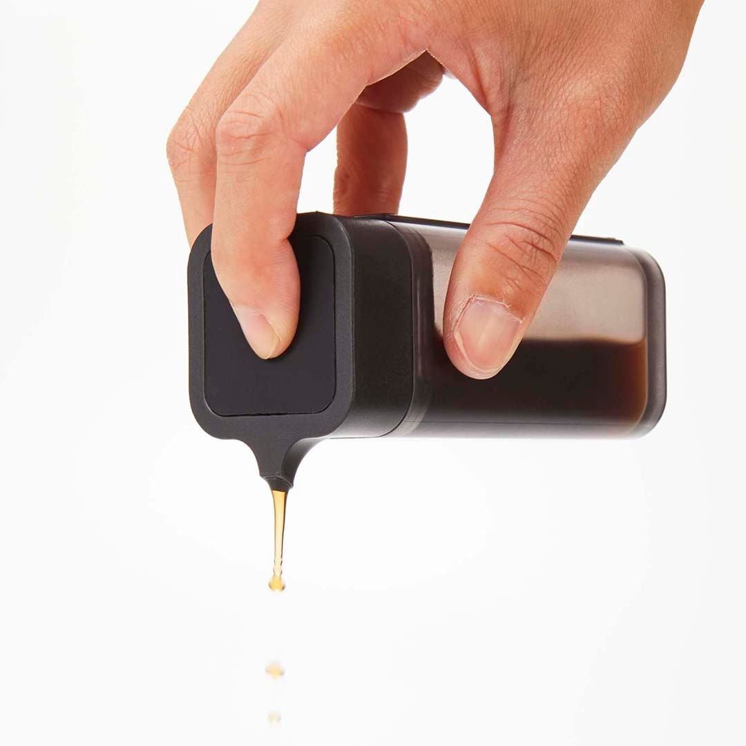 デザインだけでなく、実用性もあります。使うときは、片手で取って、片手操作でワンプッシュ。持ったままフタを押すだけで、お醤油が出せる仕組みです。お料理の最中、持っていたものを置き直す必要はありませんし、撹拌しながらの投入にも便利。ワンプッシュで出てくるタイプなので、少量ずつ投入でき「入れすぎて味が濃くなっちゃった」といった失敗も減ります。高さも10センチ程度の手に収まるちょうどいいサイズです。